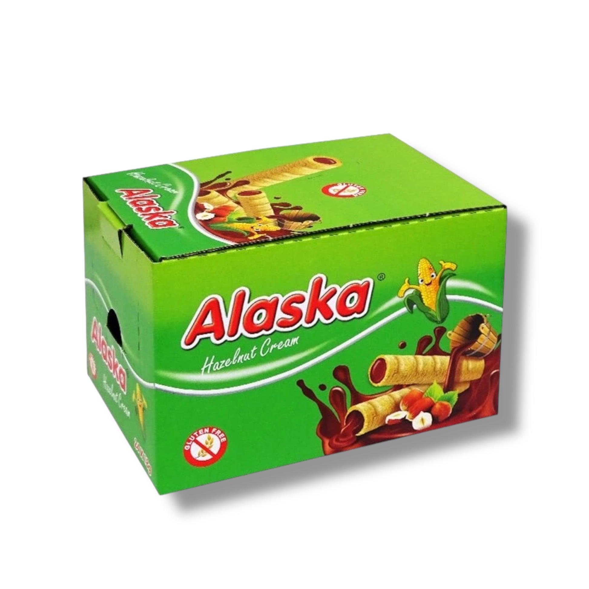 Alaska-Mais-Tuben mit Haselnüssen Glutenfreies Essen. Die Packung enthält 24 Mais-Tuben gefüllt mit schmackhafter, fettarmer Sahne mit Schokoladengeschmack. Zutaten:
