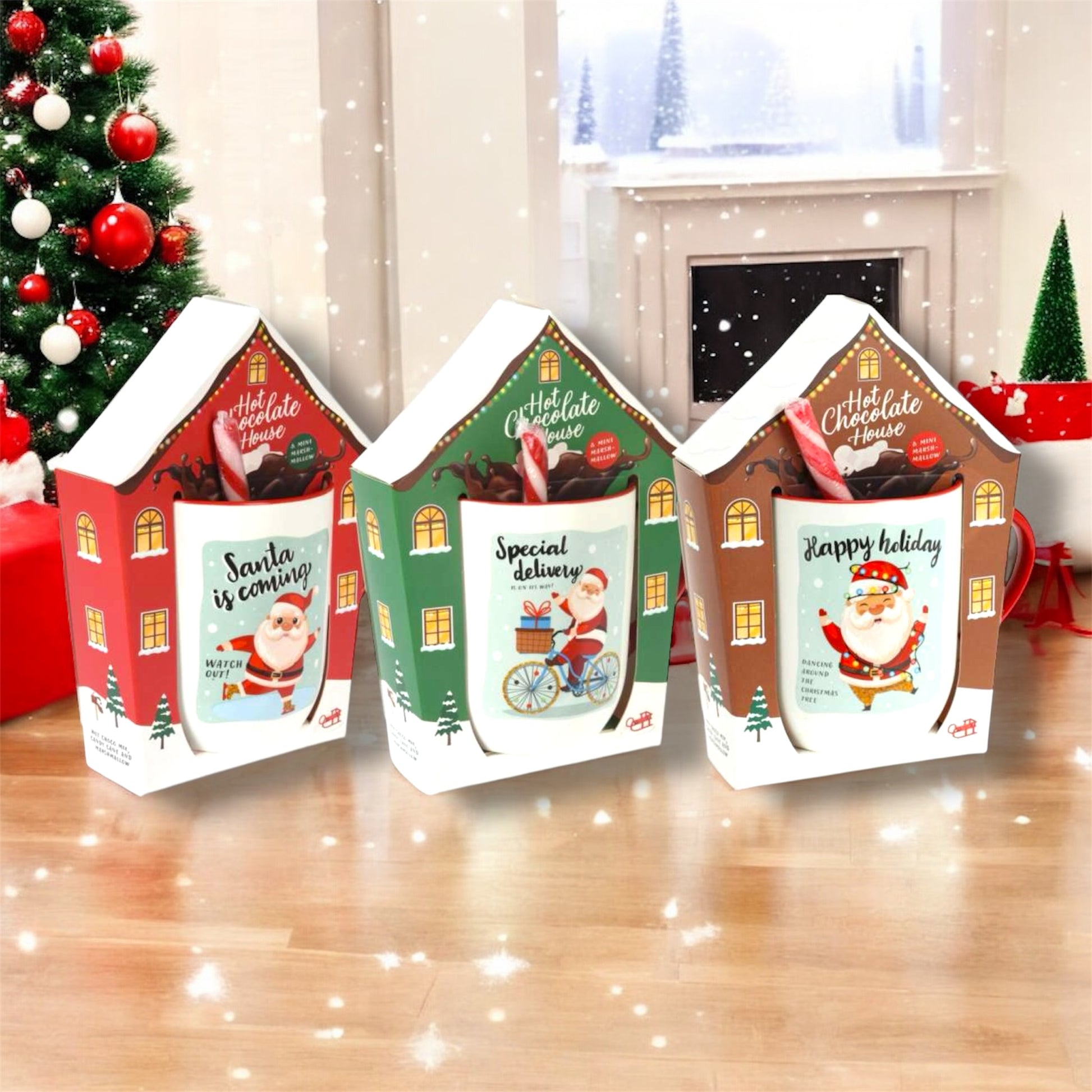 🎁 Das Geschenkset beinhaltet neben einem wunderschön bedruckten Henkelbecher, eine Heiße-Schokolade-Mischung mit der vegetarischen Geschmacksrichtung Vanille, eine kleine Tüte mit Mini-Marshmallows und eine rot-weiß gestreifte Zuckerstange.