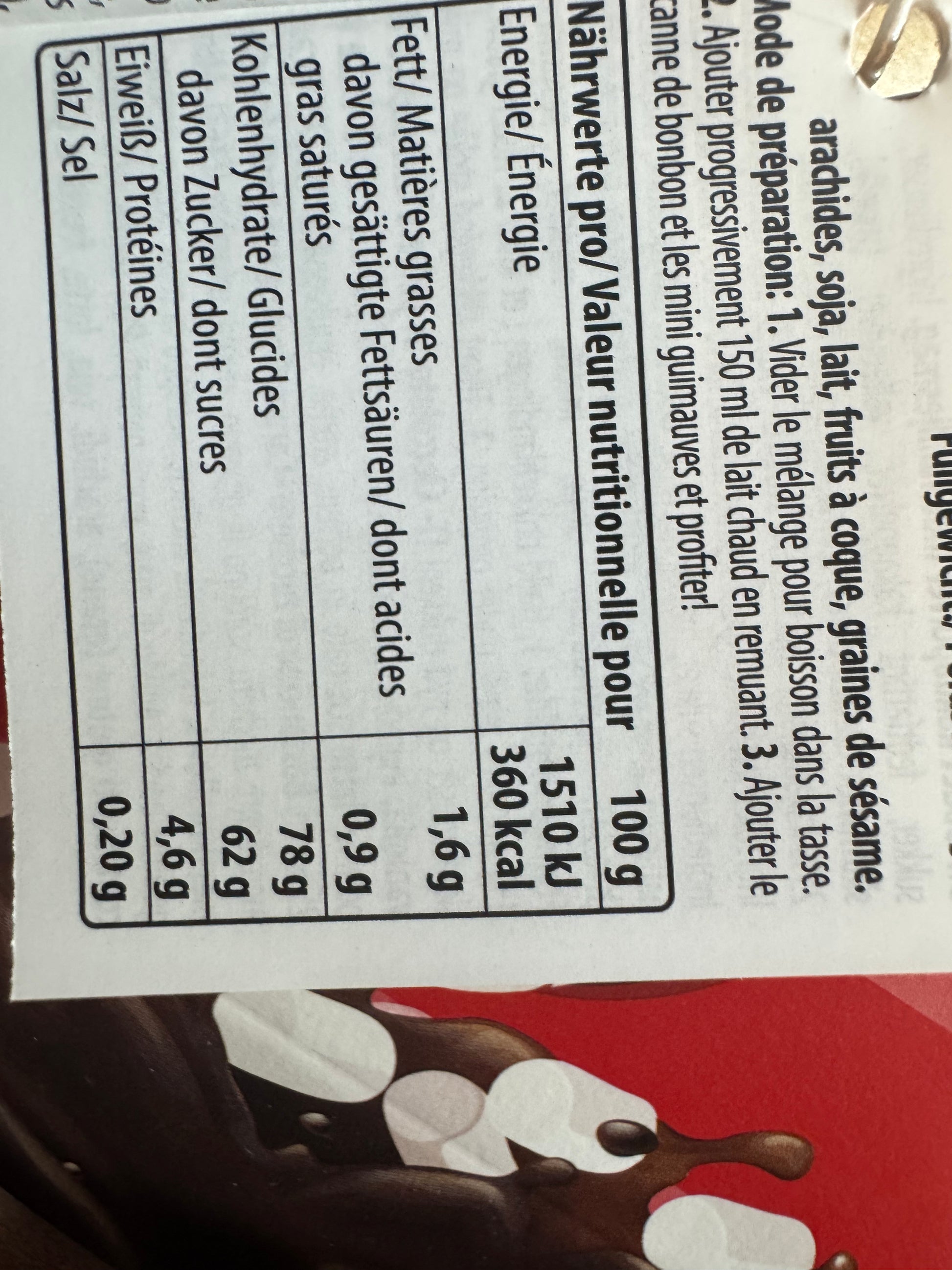 Trinkschokolade mit Vanillearoma Zucker, 25% fettarmes Kakaopulver, Molkenpulver [Milch], Magermilchpulver, Aroma, Emulgator (E322). Kakao: 25% mindestens. Zuckerstange - Hartkaramelle mit Erdbeergeschmack. Zucker, Glukosesirup, Wasser, Aroma, Farbstof (E163). Mini Schaumzucker. Zutaten: Glucose-Fructose-Sirup, Zucker, Wasser, Schweinegelatine, Dextrose, Maisstärke, Aroma.
